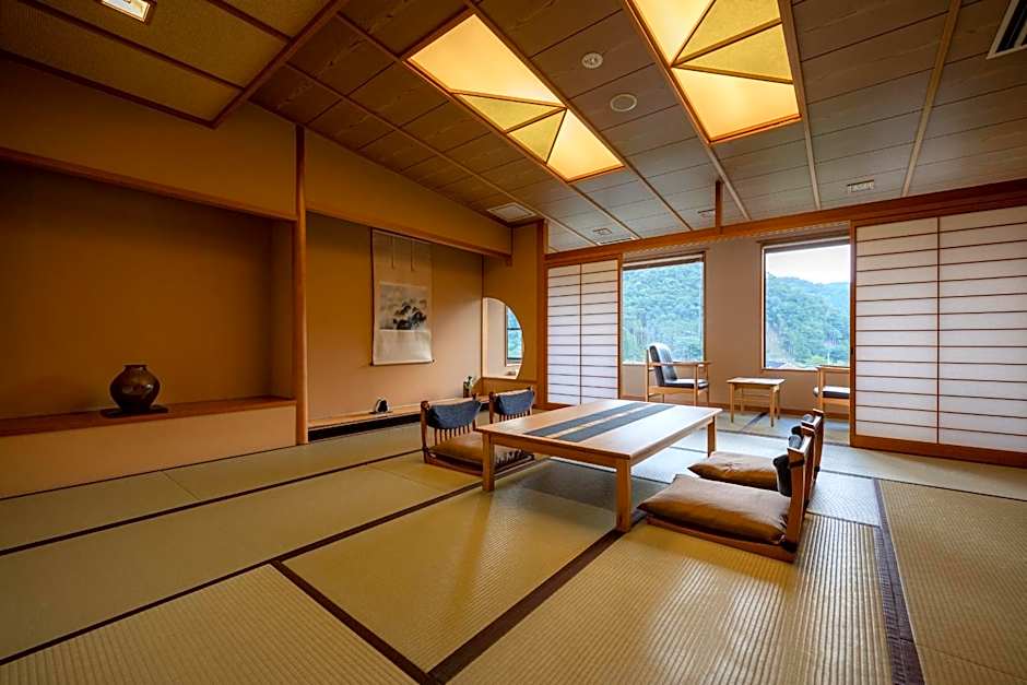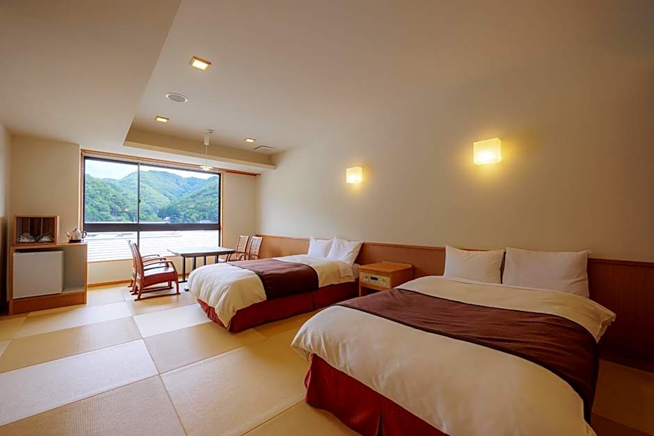 The twin room features a shared bathroom, air conditioning, tatami, as well as a seating area with a flat-screen TV. The twin room offers a wardrobe, a safe deposit box, an electric kettle, yukata and a TV. The unit offers 2 beds.
